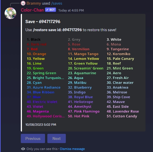 It is incredibly easy to save colors. All you need to do is use the /save command in your server. This will automatically create a full backup of your current color list. A save ID is returned after the save has been created. The returned ID will need to be used when restoring the save.