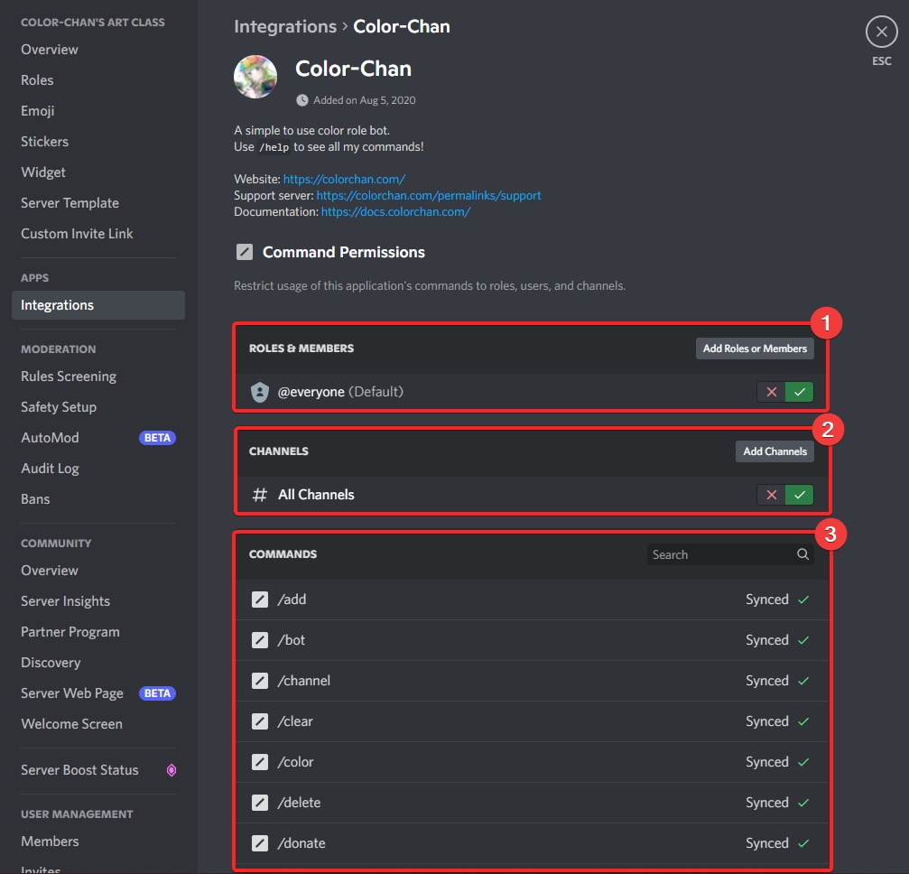 Re-invite Color-Chan to the same server with the following link: https://colorchan.com/permalinks/invite Note: You do not need to kick Color-Chan.