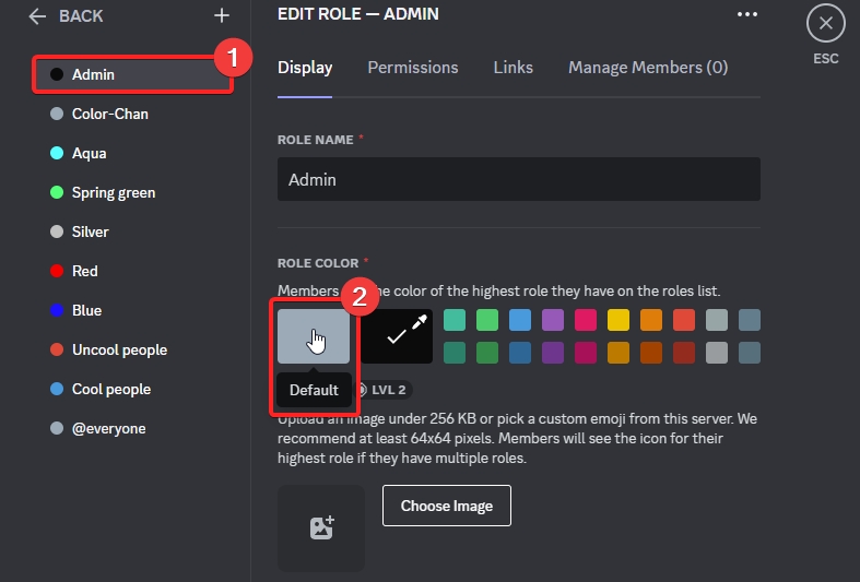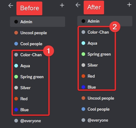 Place Color-Chan's role and the color roles above all other non-moderation roles. Don't forget to set the moderation roles to the default color as mentioned in Option 1.